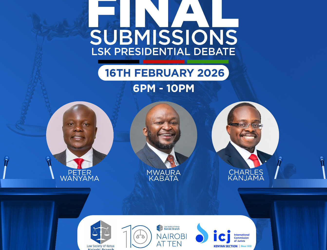 The debate will feature three legal minds Peter Wanyama, Mwaura Kabata, and Charles Kanjama who are competing to succeed the incumbent, Faith Odhiambo, in an election scheduled for February 19, 2026.